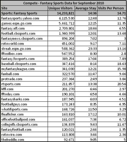 Compete drew results from a panel of “more than 2 million” Internet users based in the United States for the month of September, compiling numbers on daily reach, search habits and time spent on various fantasy sites.